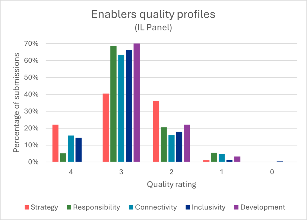 - Variation in scores between enablers or between UoAs should be attributed to different approaches taken by the assessment panels and should not be considered as differences in the quality of PCE approaches between different subject areas.